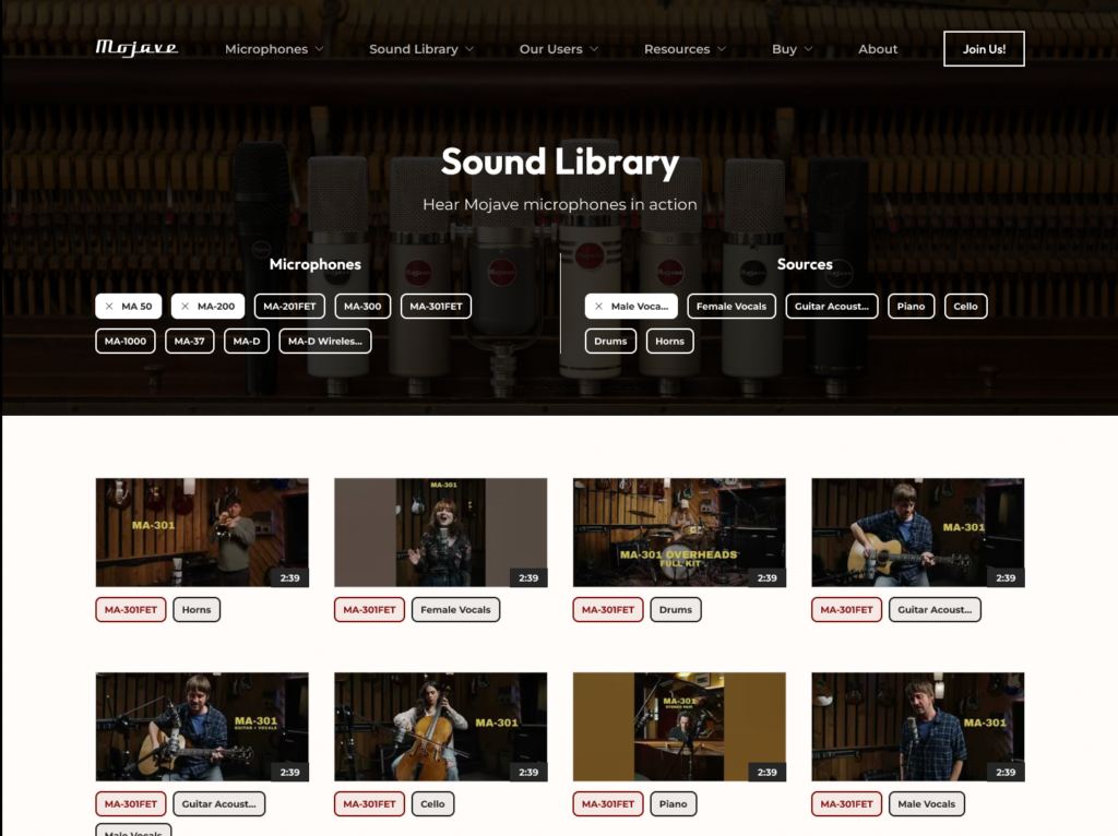 Mojave Audio came to MixBus Marketing for a complete redesign of their website. Our goal was to simplify their microphone catalog while spotlighting the incredible engineers and musicians who rely on Mojave in professional settings.